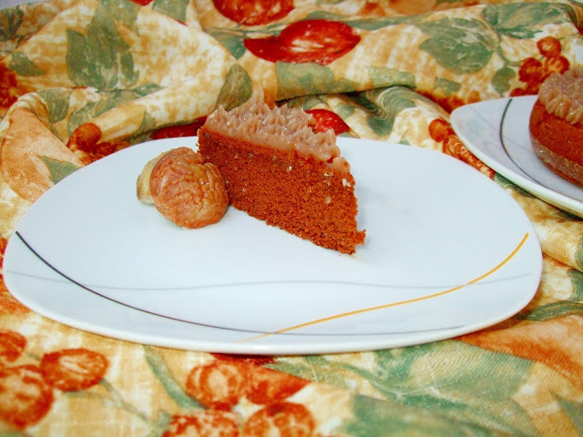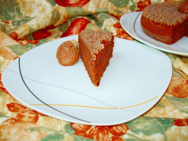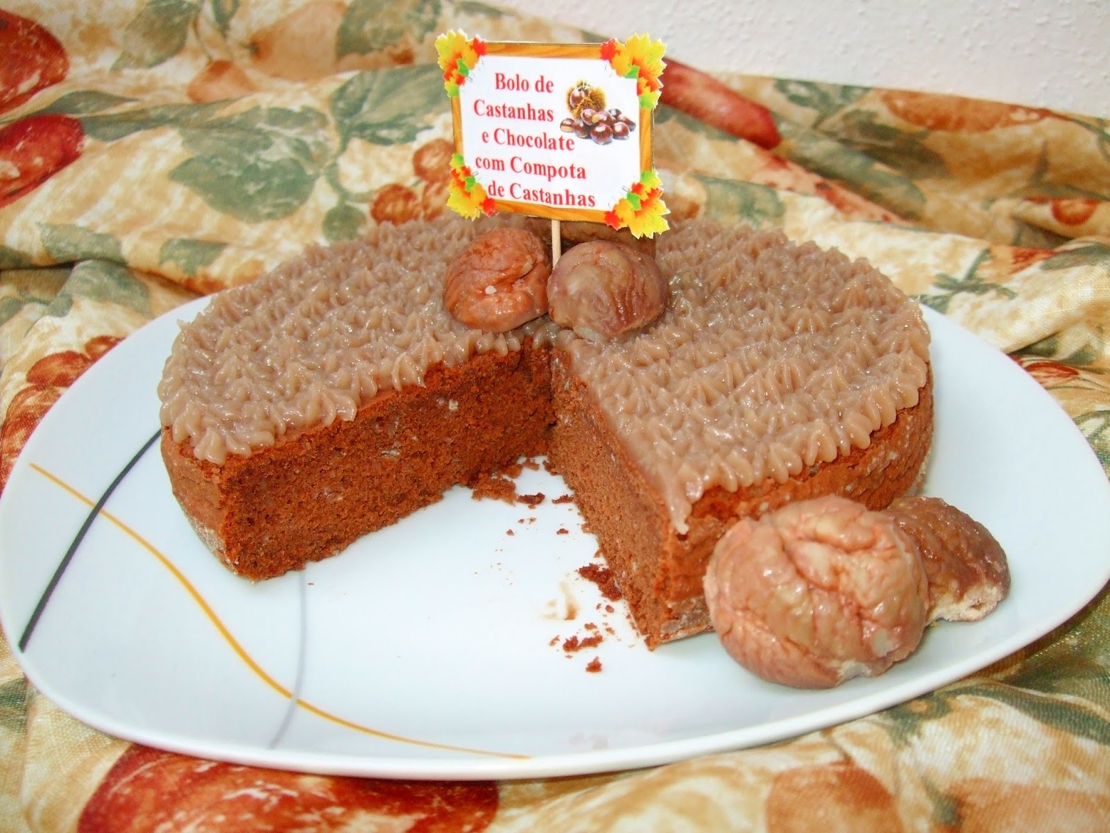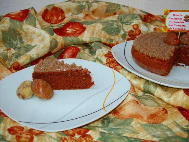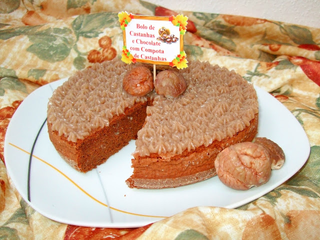 Lembram-se de aqui vos ter falado num concurso que houve na escola com sobremesas de Outono? Na altura disse-vos que havia uma história caricata em torno disso e prometi que vos contava. O concurso era simples, tínhamos de fazer uma sobremesa com produtos da época. Outono é tempo de maçãs, batata-doce, castanhas, chuchu, dióspiro, abóbora, entre tantos outros. Eu queria fazer uma sobremesa diferente. Tinha a certeza que, apesar de muitos pais serem criativos, a maioria se decidiria pelas coisas mais óbvias e fáceis como um bolo ou tarte de maçã. Não me enganei nesse aspeto embora a adesão tenha sido mais que muita (acho que na verdade todos os pais levaram o concurso muito a sério). Eu tinha testado um bolo com batata-doce (o tal que postei aqui e que também foi para a mesa da Marta na rubrica da batata-doce) e que, apesar de ser delicioso, achei não ser um bom candidato pois não sabia muito a batata-doce. Eu queria que o alimento que eu escolhesse fosse de alguma forma evidenciado e deixasse aquele factor surpresa em que as pessoas ficam incrédulas por perceber do que é feito. Acabei por não fazer apenas uma receita; para além deste bolo de castanhas fiz ainda mais três sobremesas. Não que eu quisesse a toda a força ganhar, obviamente que se isso acontecesse deixar-me-ia muito feliz por ser o prato de um dos meus filhos o vencedor, mas porque como adoro cozinhar deu-me muito gozo preparar esses doces. Tendo em conta a variedade de doces existentes no concurso achei que qualquer um poderia ganhar. Só não contava que ganhasse uns croissants de pacote! Isso mesmo! Andei possessa durante dias pois dava para perceber o quanto todos os pais se tinham empenhado para que os seus filhos participassem e no fim de contas a vitória era de uns pais que não quiseram ter trabalho e que por isso se limitaram a participar com aquilo que havia mais à mão. Eu aceitava a derrota para qualquer outro prato, menos para um doce comprado no supermercado! Acho que a batotice é um excelente valor para transmitir às crianças, não acham?! Mais tarde vim a saber que afinal tinham sido os alunos a votar e daí o resultado. Não seria de esperar outra coisa, as crianças são crianças e é natural que se rendam àquilo que os cativa mais que regra geral são as porcarias processadas. Continuo a achar que os professores e auxiliares poderiam ter votado e elegido o melhor. Depois poderiam na mesma ter dado o voto às crianças para também eles escolherem um vencedor. Pelo menos assim teriam mostrado que valorizam o trabalho dos pais, que se esforçam e dão o seu melhor quando muitas vezes estão estafados e o tempo é limitado. Assim não sei se numa próxima os pais não se vão marimbar um pouco para essas atividades... A verdade é que, segundo o meu filho, o meu bolo de castanhas foi um sucesso entre os adultos e houve quem chegou mesmo a pedir a receita. Na receita usei manteiga açoriana. Sei que na alimentação saudável a manteiga não é muito bem vista, embora do meu ponto de vista seja um alimento natural e por isso de vez em quando não faz mal. Talvez nesta receita funcionasse o azeite, óleo de coco, a manteiga de coco, a manteiga de amêndoa ou até mesmo a própria da compota de castanhas, mas só testando para perceber se de facto funciona. Tirar as fotos a este bolo também foi um grande desafio pois todas as fotos ficavam escuras e desfocadas. E pronto, cá fica a minha sugestão para a rubrica da Marta que este mês promete ser bem gulosa e decadente!